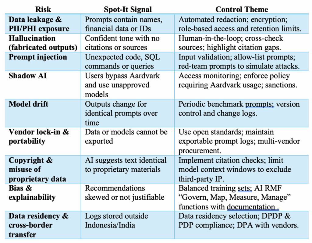Aardvark differs from consumer LLMs by embedding governance and auditability into its architecture. It forces policy compliance (ISO/IEC 27001 Annex A controls, SOC 2 CC series, COBIT 2019), logs every interaction and supports “AI management” per ISO/IEC 42001 . This is crucial when handling regulated data or evidence.